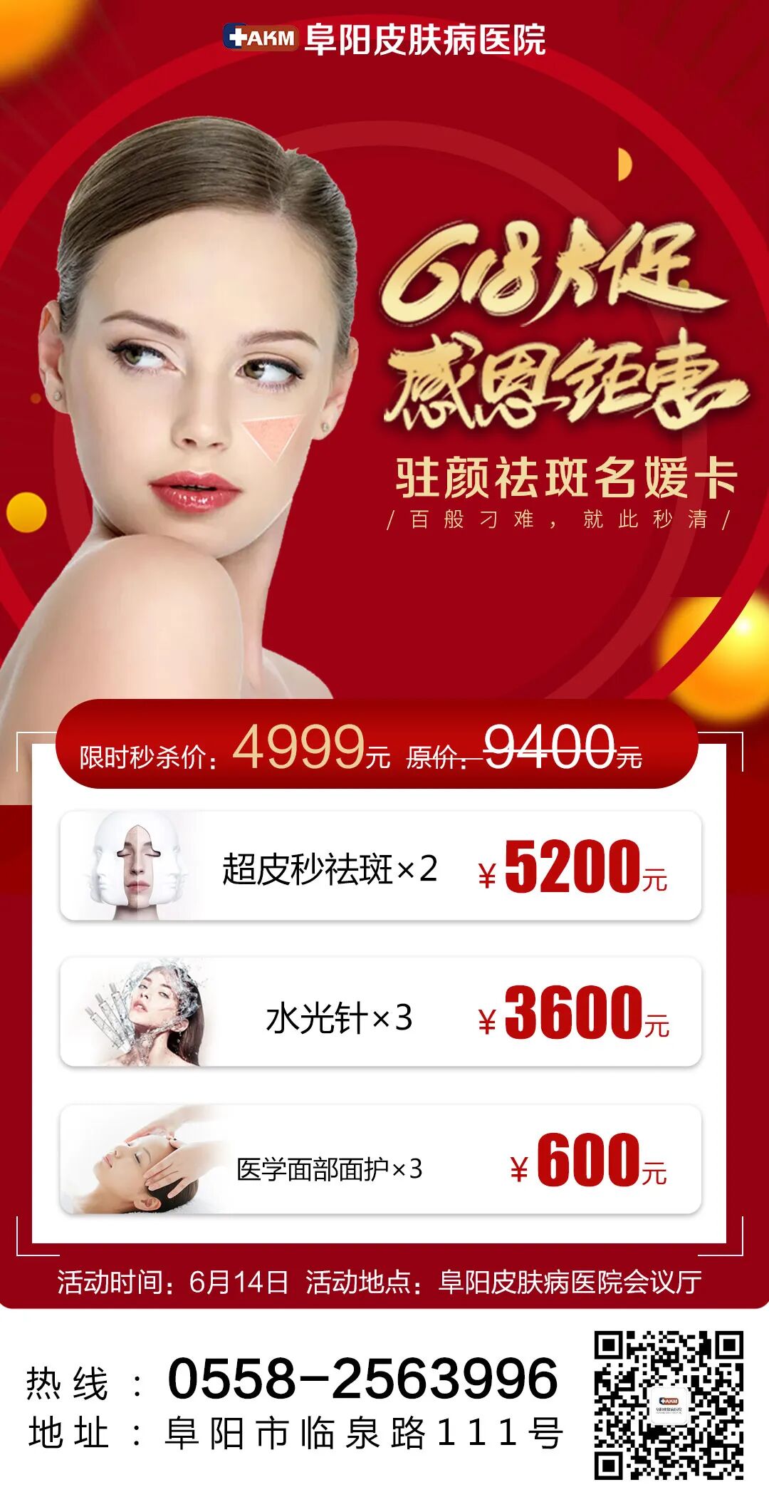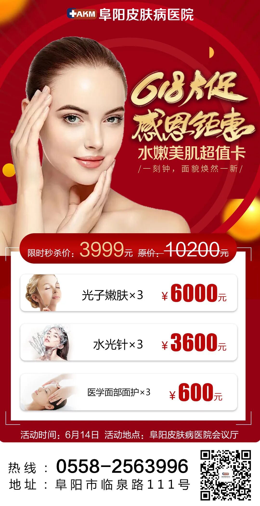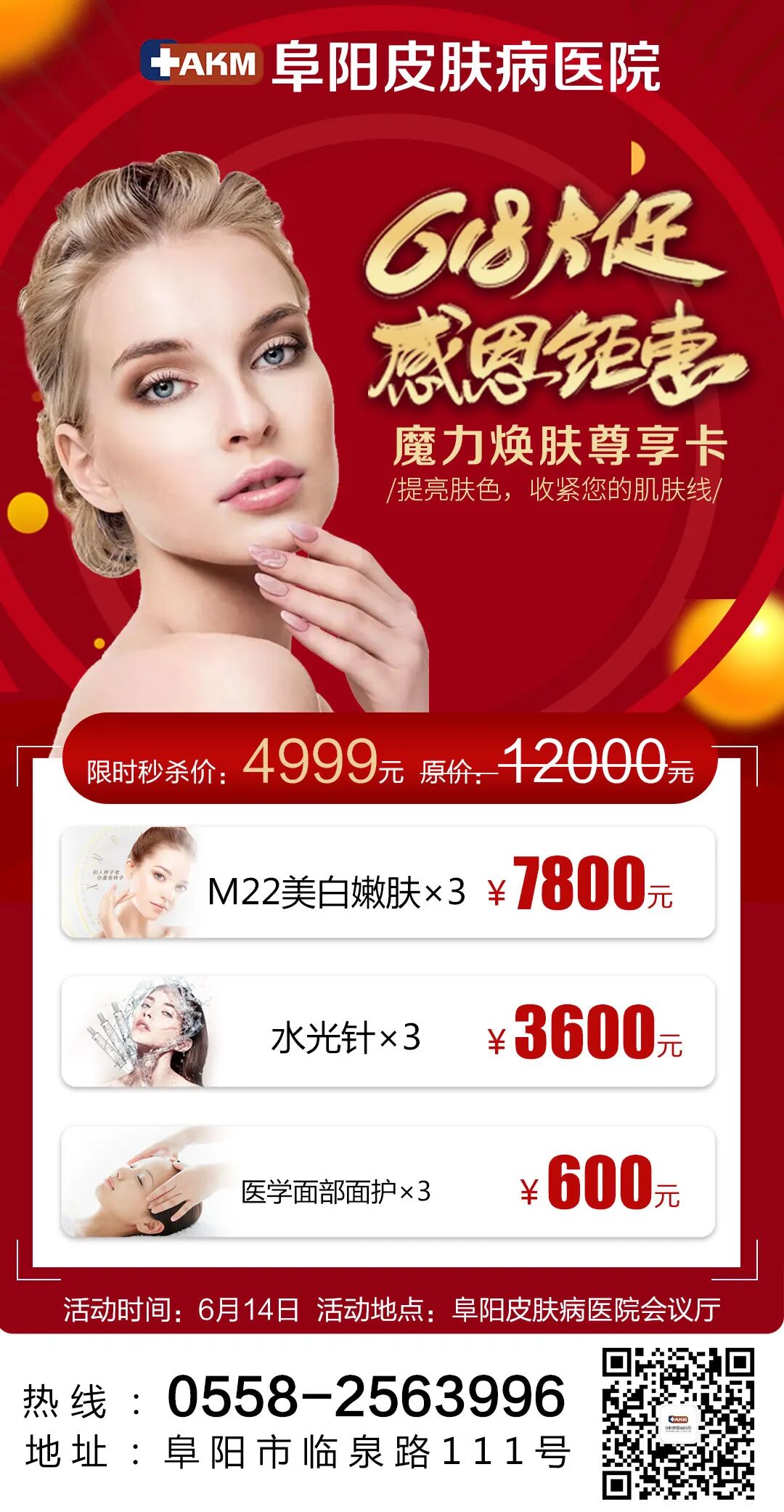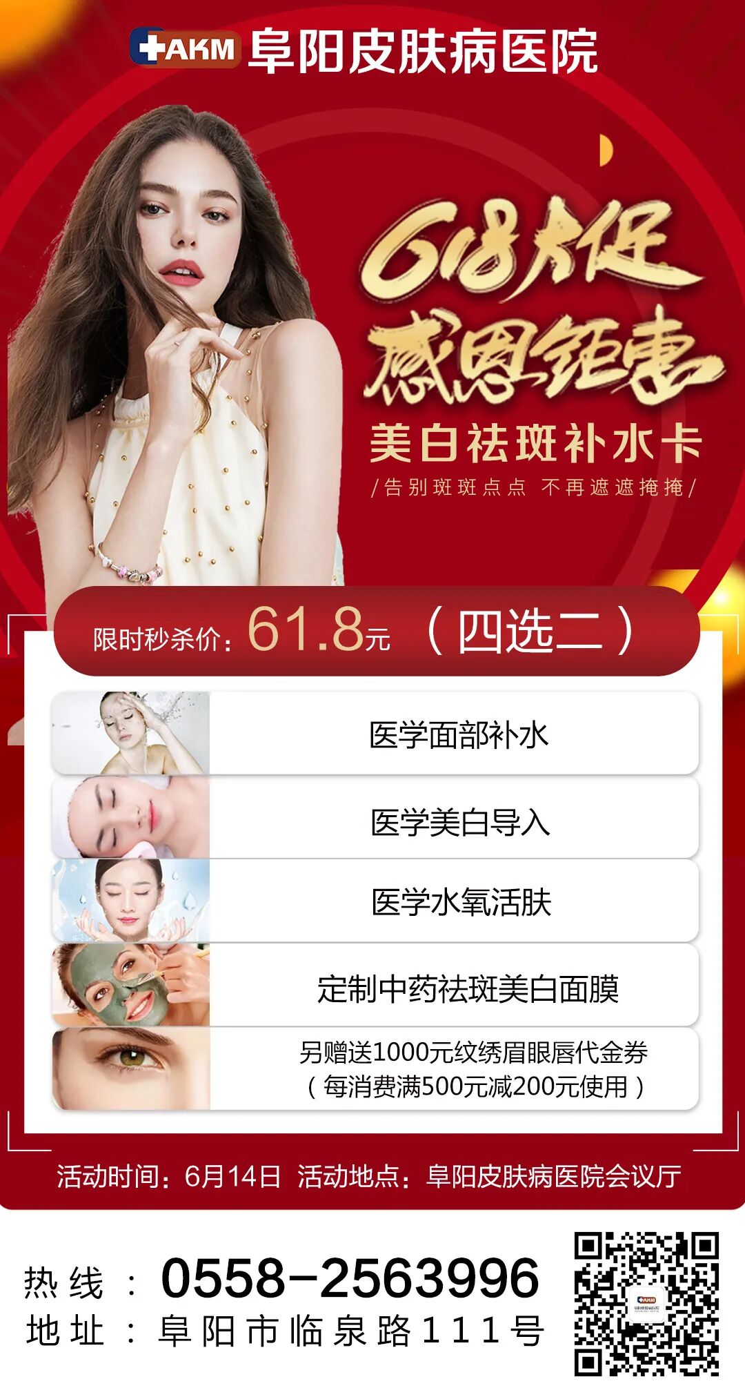 6月14日,阜阳皮肤病医院会议厅《私享沙龙会》,到院即享好礼,名额有限先到先得,另外还有更多年中大促多种套餐等您选择